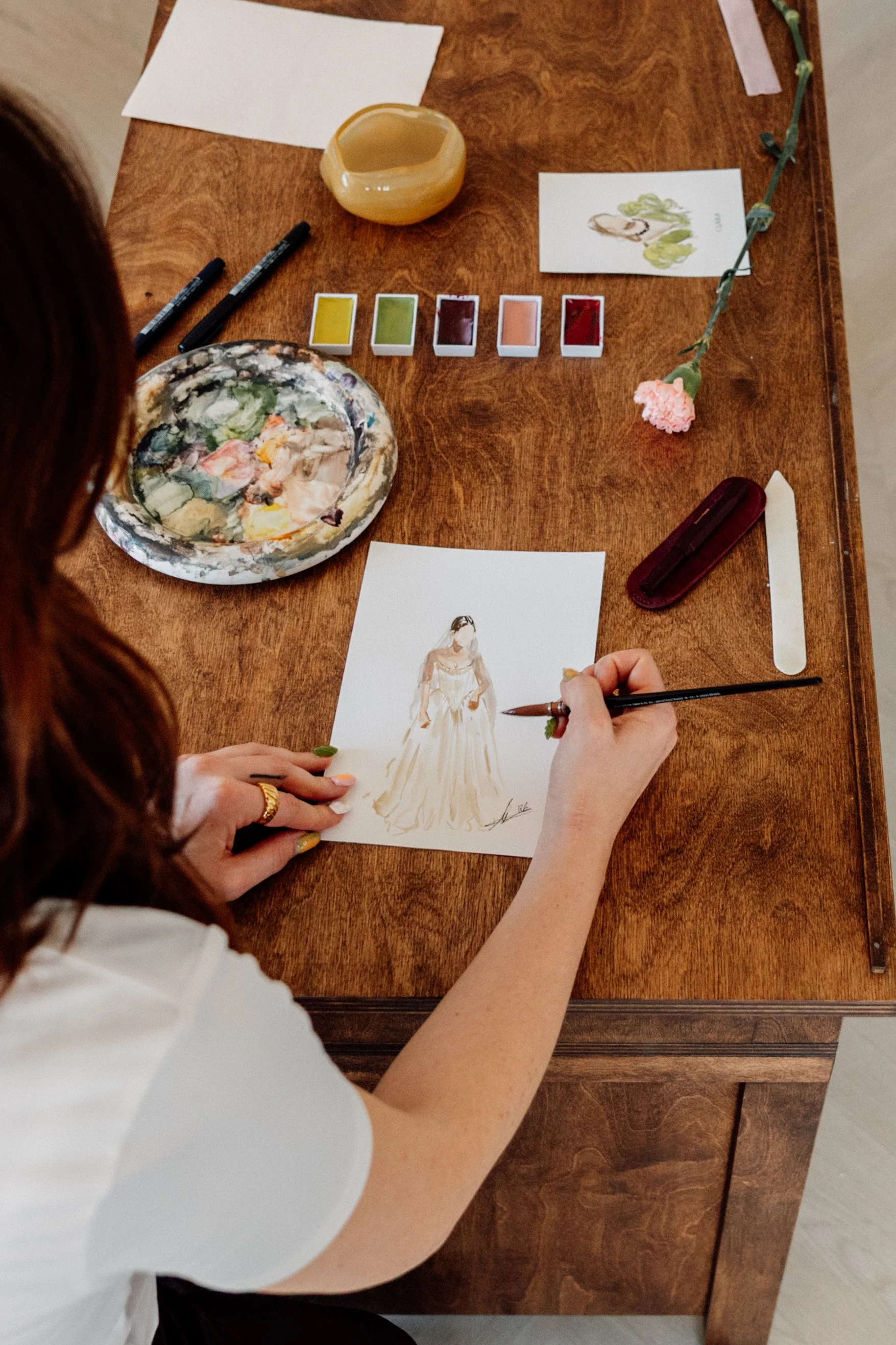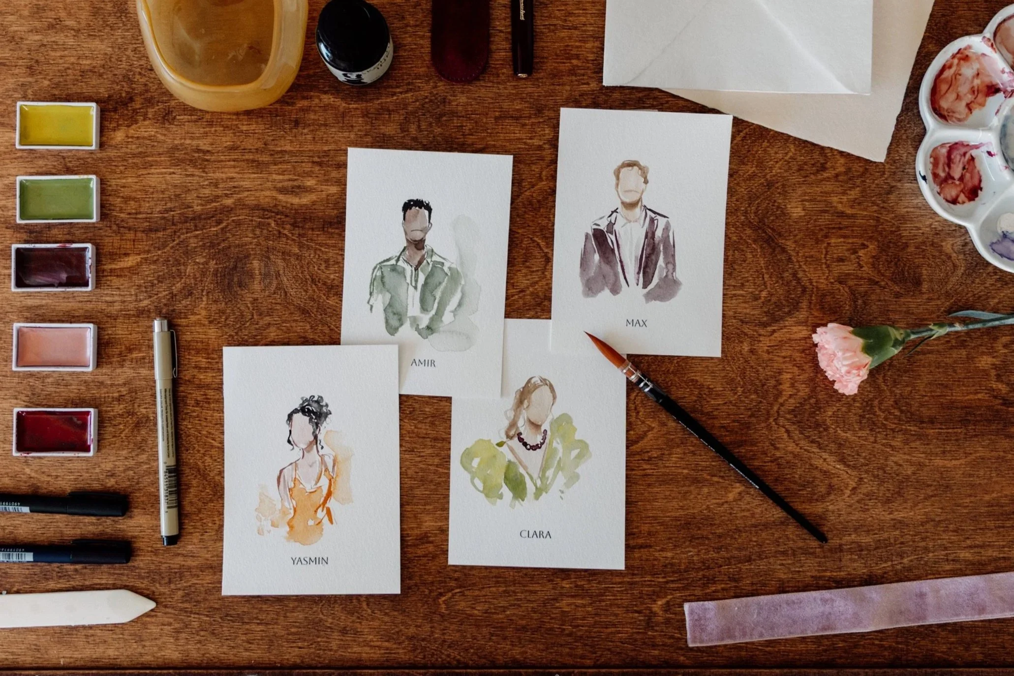 Auf Basis eurer eingesendeten Fotovorlagen erstelle ich im Atelier individuelle Aquarellportraits eurer Gäste.